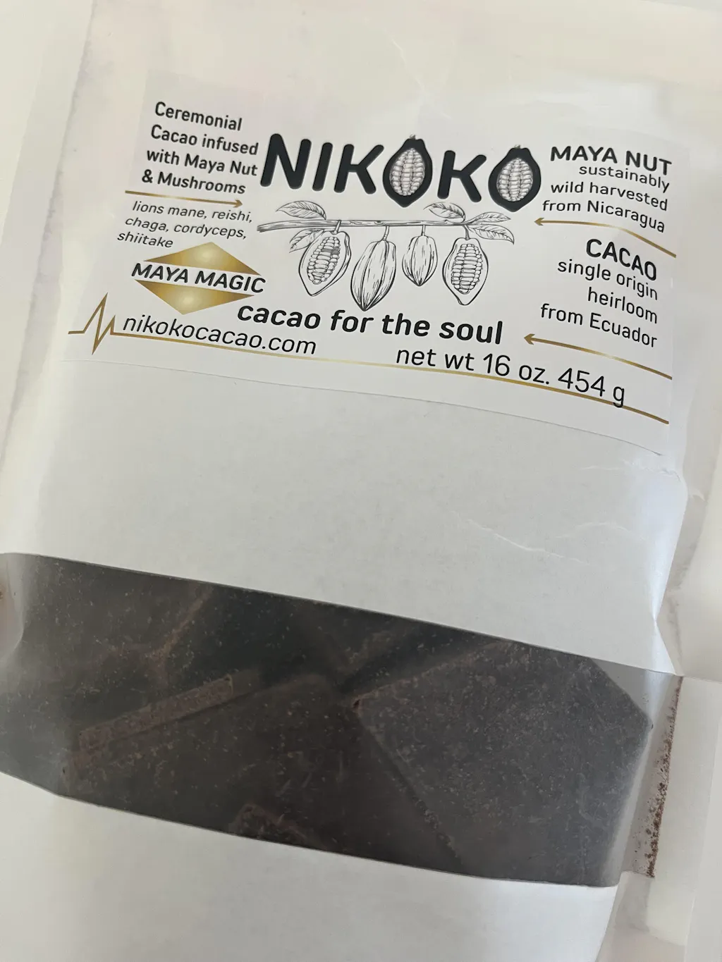 We've taken our signature maya cacao and milled it with the highest quality log grown, fruiting body, functional mushroom blend; reishi, chaga, lions mane, cordyceps and shiitake to create a one-of-a-kind, premium and medicinal cacao. In 1 oz of cacao there is 2.1 grams of mushroom powder or 2100 mg.